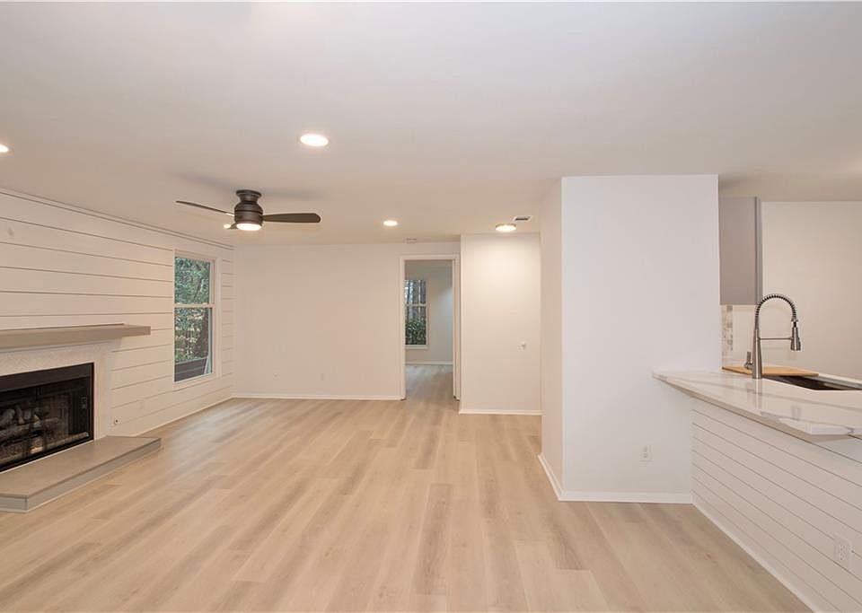 Call the movers and move right in to this fully updated end unit condo nestled in a quiet Brookhaven community. Updates include fresh paint throughout, smooth ceilings, luxury vinyl plank flooring throughout, all new LED lighting throughout, primary bath with spacious walk-in shower, double vanity, quartz counters, LED vanity lights, metal framed mirrors, dual flush toilet, custom shelving. Kitchen features high end stainless steel appliances with gas cooktop, calacatta quartz countertops, marble backsplash, brand new shaker style cabinetry, chef style Kohler sink with built in cutting board/ work station. Living room features a shiplap accent wall, fireplace with marble surround, dining area and sliding door leading to a spacious covered patio with private, quiet wooded view. Primary bedroom features a large walk in closet w/ designer barn door and custom closet, accent wall and patio access, secondary bedroom is spacious with a large walk in closet w/ custom shelves and features a full bath with new tub, tile surround, shaker style vanity, quartz top, metal mirror and LED vanity light. Storage closet is located on the patio and laundry closet is located off kitchen. Location within Brookhaven is superb with easy access to Buckhead and Midtown.