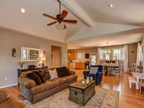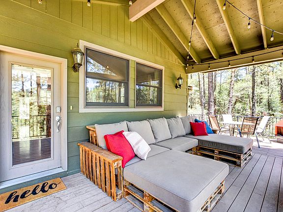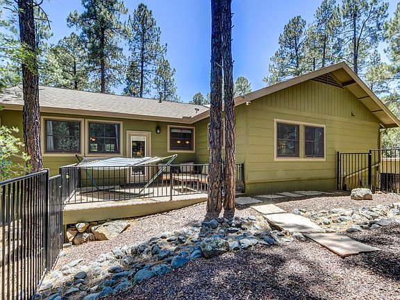 Furnished, upscale family home in the Ponderosa pines, yet only 6 miles (approx) from downtown! Beautiful home was built in 2005, is 2400 sf and includes 4 bedrooms, 2 baths and oversized 1 car garage plus large storage shed situated on a 1/3 acre in the Ponderosa Pines community. Beautifully appointed home includes neutral colors, bamboo flooring, Andersen windows. The living room includes a high beamed ceiling and cozy gas fireplace. Large kitchen with wood cabinets and contemporary glass backsplash. Large Trex deck wraps around front & side-perfect for summer BBQs and relaxing in the pines. Large master suite with sep shower and jetted tub, dual sinks. Feels like you are deep in the woods, but it's close to everything! Driveway can easily accomodate RV/trailer. Don't miss this home.