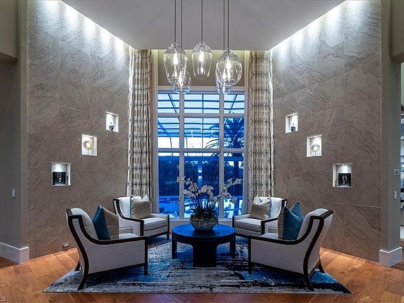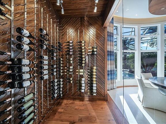 This exquisite estate home offers luxury and sophistication. The thoughtfully designed Oakmont Model by Seagate Development Group features an open floor plan including a gourmet chefs kitchen with Thermador appliances, a stunning onyx bar with under-lighting, a massive glass wine room, motorized custom window treatments throughout, Control 4 home automation, electric hurricane shutters, 4 AC garages, a whole house Generac generator and more.The Master suite is a tranquil oasis with views of the pool and golf course from the bedroom and the the bathroom features pocketing sliders opening to a covered garden with a zen like water feature, dual sinks, a coffee bar with mini fridge and an additional washer and dryer. The expansive outdoor space includes 4 distinct living spaces for outdoor entertaining and enjoyment, including an outdoor kitchen and bar, fireplace, dining and lounge areas with electric hurricane screens on covered areas, and a dedicated pool bath. The infinity edge pool, spa, and water feature offer stunning Western views of the 9th fairway on the pristine Lakes course. This lovely home is being sold furnished.