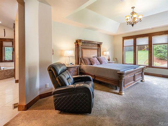 Tucked away on nearly an acre,this 5 bed 6 bath retreat lives like a private resort. Mature landscaping, fruit trees & bordered by open space,this rare find in Golden is built for effortless indoor/outdoor living. Step into a soaring two-story foyer & be greeted by glowing Cherry wood floors, setting the tone for refined & modern design in this fully integrated Lutron smart home. A wall of windows welcome you to the main floor primary suite,a true haven w/ patio access, his & her closets, a luxury bath w/ a jetted tub & an indulgent steam shower w/13 heads, surround sound, custom lighting & towel warmer. A private office tucked just off the primary offers custom built-ins & sweeping views of landscaped grounds. The gourmet kitchen opens to a sunny eating area w/ floor to ceiling sunshine & access outside. Stainless GE Profile appliances, including 2 convection ovens, wine cooler, custom Alder cabinetry w/ pull out shelving & soft close drawers & a chef's island outfitted w/additional gas burners. You'll also find a generous pantry w/an extra built in fridge/freezer for real life convenience. The mudroom delivers w/organized storage off the insulated 3 car garage, & the main level laundry blends practical design w/style & function.The upper level offers 3 spacious bedrooms:one a private en-suite & the other two sharing a well designed Jack & Jill. All 3 enjoy walk-in closets & plenty of natural light. A custom Italian pivot-door reveals the 'chef's kiss' of a newly finished daylight basement. A rough stacked marble wet-bar, exposed beams wrapped in Alder, 10' ceilings & drink ledges, show craftsmanship & true attention to detail, while a theater ready media wall w/integrated surround sound is built for game-day energy. You'll find a 2nd beautifully designed primary suite, generous storage & a guest powder room to further enhance the space.Finally, Colorado living steals the show w/a fully equipped outdoor kitchen in your backyard oasis,complete w/ retractable awning.