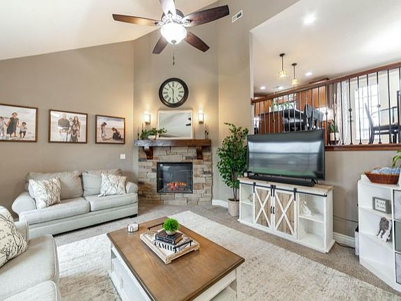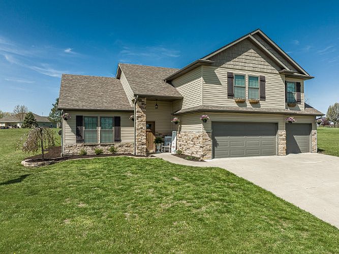 Move-in ready Craftsman style Imhoff Construction. Beautiful setting on a one-acre lot in the desirable Timberlake Estates subdivision. Community Lake with dock for fishing or enjoying sunsets! This home's kitchen features black granite countertops, stainless steel appliances and walk-in pantry, that overlooks a modern layout with open living space for easy entertaining. Gas fireplace in living room with vaulted ceiling. laundry on main level with master suite. Finished basement with wet bar bedroom and full bath. Conveniently raised garden beds and fruit trees. Freshly mulched flower planting beds are ready for you to choose your plants!