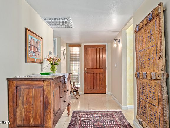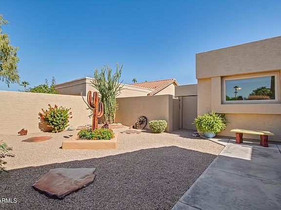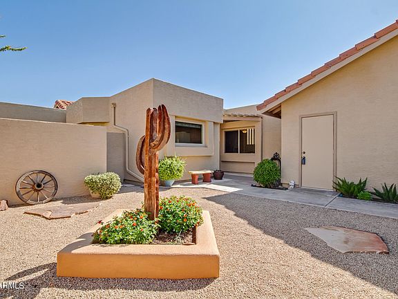 This Arizona dream home has it all! 2Bed/2bath home situated at the end of the cul-de-sac on over-sized lot. Enter the gated front courtyard with charming desert landscaping to this beautiful home. Light bright with neutral colors throughout includes hardwood plank and travertine flooring. Living room with fireplace has soaring vaulted ceilings with wood beam accent. Updated kitchen designed by Stone Creek features beautiful cabinets and granite counter tops. Primary suite has an arcadia door that leads to cozy covered patio. Primary bath has been updated with tiled dual counter vanities and tiled shower. Second bedroom has walk-in closet and separate access door to hall bath. Backyard oasis is made for entertaining! Travertine tiled covered patio, custom-built BBQ station with pergola