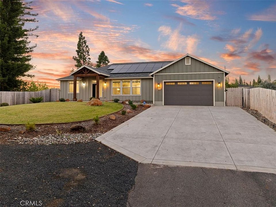 This custom contemporary home has many custom design upgrades including high ceilings with oversized windows for great lighting and nice custom window coverings. Tiled wall features an electric fireplace built into the wall. Large dining area adjacent to a well laid out kitchen that features quartz countertops and soft close cabinets. Samsung appliances - gas range with air fryer, dishwasher, microwave hood. Large en suite bath with glass walk-in shower, soaking tub, dual sinks, quartz counter, tiled walls, large walk-in closet. Adjacent is a large laundry room, again with quartz counters, sink, soft close cabinets and dryer hookups for gas or electric. Two additional bedrooms and bath at the opposite end of the home. Fully sheet rocked garage with a 50 amp RV outlet on the exterior wall. Attic is double insulated, ceiling & roof. The most resent cost savings upgrade (2024) is a 20-panel solar system. This is an assumable NEM2 contract with a more favorable rate. There is a $26k loan associated with that system that will be paid off in escrow with a full price offer.