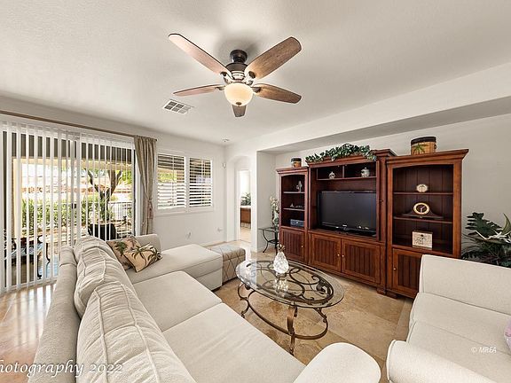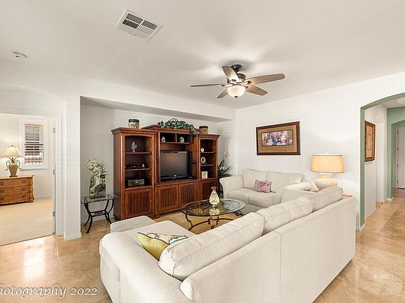 Simply Stunning! Walk in to Gorgeous Stone Tile Flooring throughout all main living areas. Beautiful Kitchen with Custom Granite Counters and a Large Island. Plenty of Cabinets and a Good Sized Dining Nook with windows to enjoy the backyard view. Upscale carpet in the 3 bedrooms. Master bedroom suite is in the back of the home with the other 2 bedrooms and bath in the front. Open floor plan is spacious with a large great room. Front glass door adds extra light. Shutters throughout the home add charm as well as energy efficiency. Large covered back patio and mature green trees and bushes for privacy and shade. Awning has been added for extra shade and pavers are extended. Flowering desert bushes and palm trees add color and style to the low maintenance desert scape. Faux lawn is pretty and the whole back yard has 5 foot wrought iron fencing. Air Conditioner has just been updated with whole new compressor ($2875) Located right next to the Canyons Golf Course with views from the front yard. SID is paid.