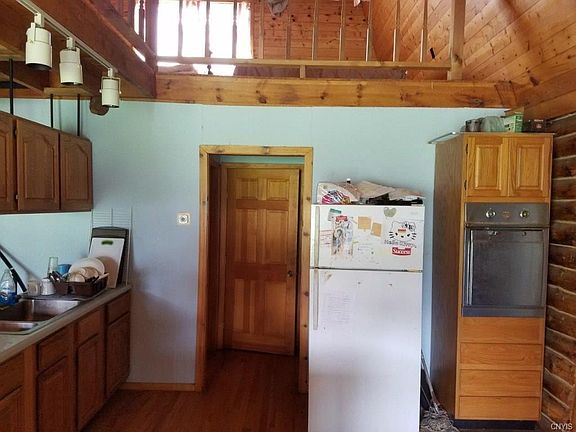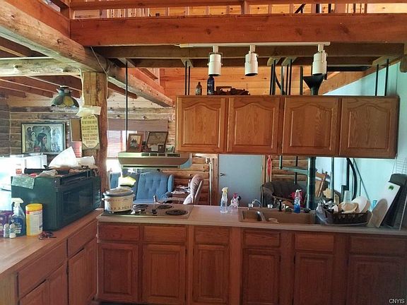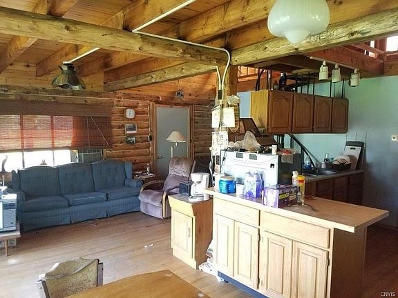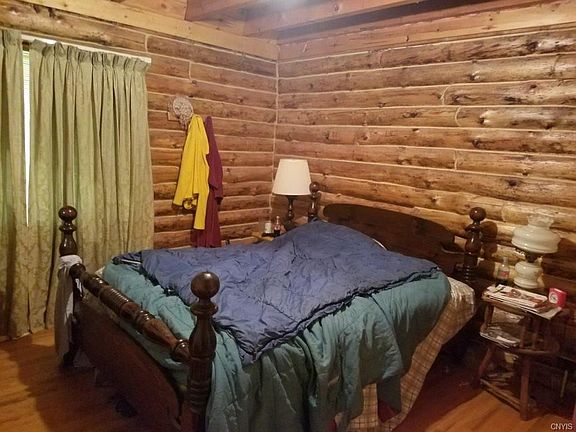 This log home sits off the road on 3 acres at the corner of Cemetery Hill and State Route 248 in the quaint Town of Rexville.  It is a unique home built with red pine harvested from the local Greenwood State Forest and features an open layout with beautiful wood beams, hardwood floors, large loft, and two covered decks. Enter the home from the back porch into the kitchen that opens to a spacious living room with a spiral staircase leading up to the large loft.  The home sits on a full basement with a one car garage and includes a new natural gas furnace. This peaceful country setting has the convenience of town water, natural gas, and the country store located across the street.  Bennetts Creek runs through the north side of the property and is stocked with trout by the DEC annually.