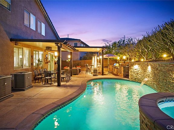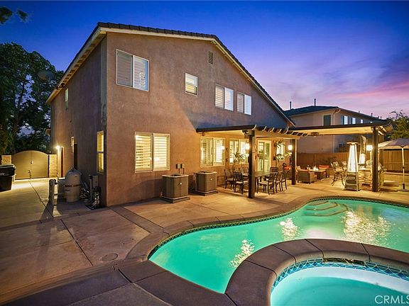 Welcome to this stunning pool home located in the heart of Eastvale, offering an unparalleled living experience! This gorgeous home is owned by the original owners, featuring five spacious bedrooms and three bathrooms, One bedroom and full bathroom located on the first floor ideal for overnight guests. Endless upgrades include wood flooring, crown molding, shutters, recessed lighting, ceiling fans, and MORE! This open floor plan makes entertaining a breeze including the kitchen boasting an ample amount of counter space, granite countertops, stainless steel appliances, backsplash, center island with additional seating and plenty of custom cabinets that add a touch of elegance to the space. The upgraded flooring installed throughout provides a sleek and modern look that is easy to maintain. The adjacent family room is flanked by a fireplace and oversized windows allowing plenty of natural lighting to shine through. Upstairs you will find the additional bedrooms including the master bedroom showcasing a spacious en-suite with a deep soaking tub, walk-in closet and dual sinks. All bedrooms have ceiling fans installed, perfect for those warm summer nights. Moving along to the resort style backyard provides you the perfect "Stay-Cation" experience including the private pool and spa, a covered patio, full outdoor kitchen with a built-in BBQ, Built-in smoker, and a 5 grill burner! An entertainer's DREAM! Additional additions include a new Culligan water softening system that was recently installed and paid off, 3 WiFi security cameras, outside shed, and 2 new a/c units. Located just minutes away from the popular Eastvale shopping center, restaurants and award winning schools. You do not want to pass this up, schedule your private showing today!
