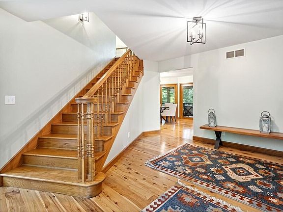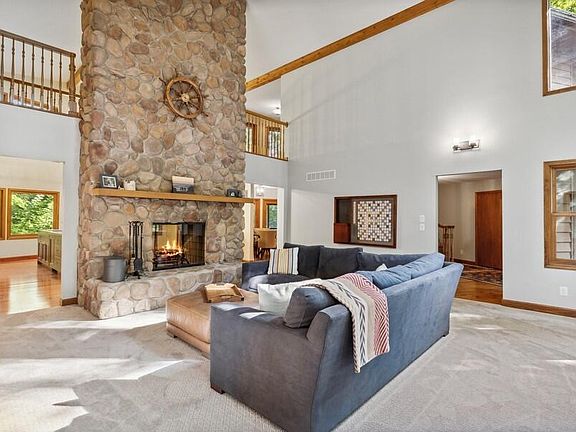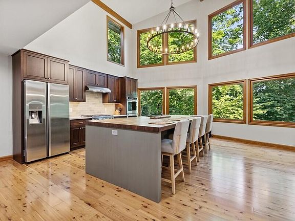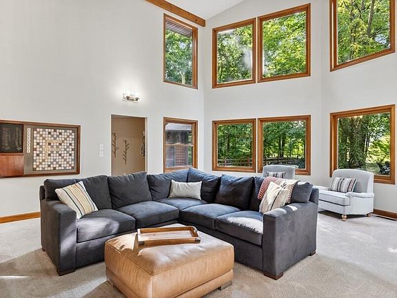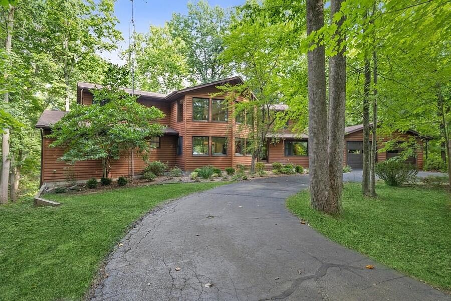 Contemporary 7 bed / 6 bath home set upon 31+ acres with 1,000 feet of Galien River frontage, heated inground pool, exquisite trails, pond and more. The 6,340 sq ft home is set about a quarter-mile from the road and offers unparalleled privacy in a densely wooded natural setting. The heart of the home is a chef's kitchen with 25' soaring ceilings, enormous center island, quality cabinetry, pro-appliances, wood-burning fireplace and access to the screened porch and dining room. All rooms offer picturesque year-round views including the daylight walk-out lower level with 2,700 sq ft of entertaining/living spaces. Solar panels offset power usage, whole house generator, attached garage, tillable acreage (rented to local organic farmer) and large outbuilding can be converted to a pool house.