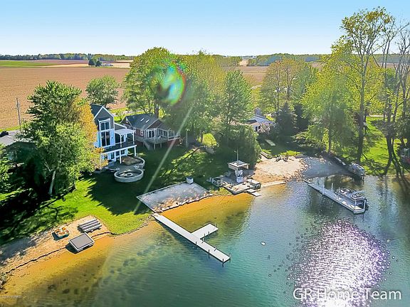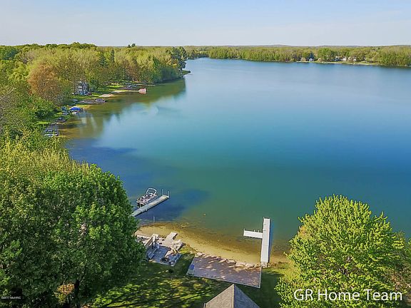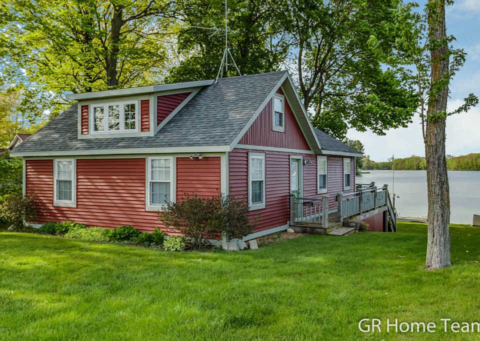 A sweet place to create memories for a lifetime! This fabulous slice of heaven just 45 minutes from GR maybe just what you need to get away for one night or the whole summer! Completely gutted, remodeled and added to 10-12 years ago make this a move-in this summer and bring your beach towels place! The open main floor offers views of the lake from each corner with a great space for entertaining small or large groups. The great room offers skylights, slider to deck with stairs, and open to the kitchen with center island with snack bar, plus flexible dining space. Also, 3-season room and 2 bedrooms. The upper level is huge room for multiple beds for your overnight guests. Plus storage shed and space under home. Located on all-sports fun-filled lake with 50' of private water frontage!