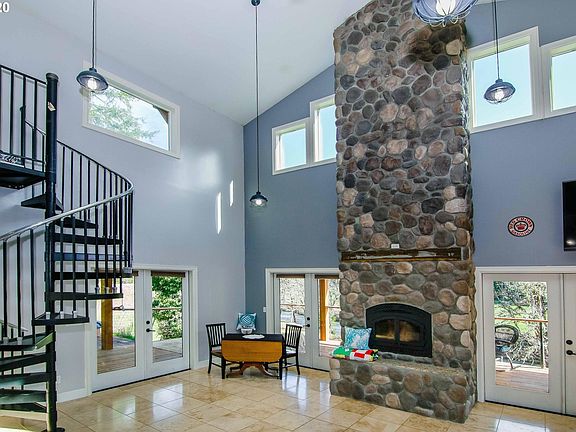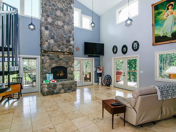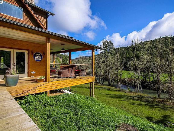 Enjoy the picturesque & private setting on the Calapooya Creek from this gorgeous custom home! Some fine features include: floor to ceiling FP w/granite hearth, 23' ceilings, travertine floors, French doors, gourmet kitchen w/island, SS appls, double ovens & a huge master suite w/tile bath & shower w/stone floor. Relax or entertain from the extensive covered wraparound porch w/an outdoor FP, or enjoy the sandy beach w/the best swimming hole!