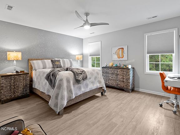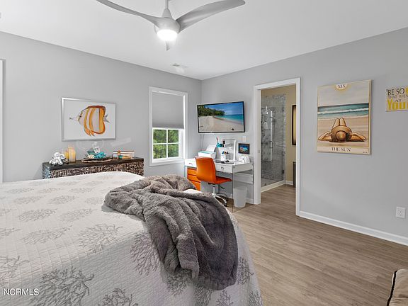 This townhome just minutes from the Surf City beaches comes with all the bells and whistles. Featuring white shaker cabinets, quartz countertops, a fireclay 30'' white farmhouse sink, and KitchenAid appliances. The master bedroom showcases an enormous walk in closet with a professionally installed closet organizer. This closet could easily be converted to a third bedroom upstairs. Tranquility abounds in the luxury shower enclosed with glass doors in the master bath. The laundry room is accented by a barn door entrance and includes the stackable washer and dyer as well as fantastic cabinet and counter space. The open concept kitchen, dining, and living area are enhanced with Coretec flooring that stretches throughout the entire upstairs (no carpet in the house at all!). A built in workspace and full bathroom accompany the downstairs space which has endless possibilities for use. The screened in porch with metal roof is a great place to rock and relax. Did we mention the rocking chairs stay? Home comes furnished with all of the upstairs furniture and appliances, the screened in porch furniture, and the lawn tools. Walk in the door ready to relax and unwind! Call today for your personal showing!