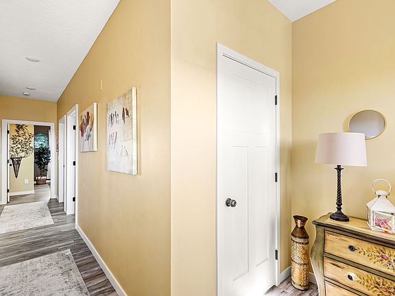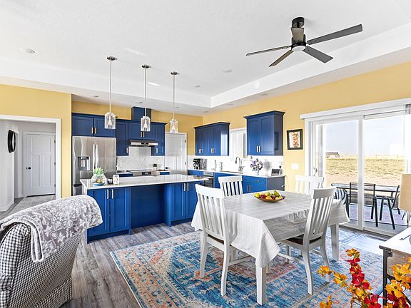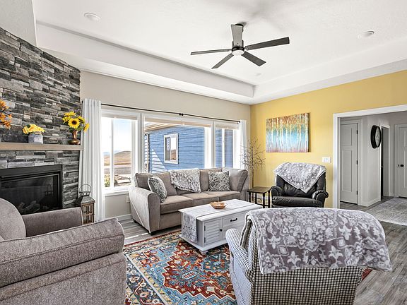 The open-concept living area is highlighted by a stunning natural gas fireplace, creating a warm and inviting atmosphere. Large Anderson windows flood the space with natural light and Cooking enthusiasts will love the gourmet kitchen, which boasts sleek granite countertops, a Frigidaire induction range, and a Bosch Wi-Fi connected dishwasher—perfect for modern living. The home is equipped with state-of-the-art amenities, including Wi-Fi connected thermostat, dishwasher and garage doors. The property also has ceiling fans in every room and security cameras that will stay. The heated garage is great for keeping those vehicles warm in the winter. Landscaping has been started with around 25 trees that have been planted.