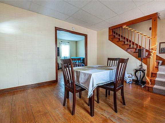 This charming 3-bedroom, 1.5-bath colonial boasts timeless appeal with its full vinyl facade and inviting covered front porch. Step inside to discover original hardwood floors that flow seamlessly from the spacious family room—featuring a striking floor-to-ceiling stacked stone accent wall—into the elegant dining room. The well-appointed kitchen offers ample cabinetry, tile flooring, wood paneling with chair rails, a stylish stone backsplash, and a cozy eating area. An enclosed patio provides additional living space with tile floors, a ceiling fan, a convenient laundry area, and backyard access. A powder room with tile flooring completes the main level. Upstairs, all three bedrooms feature plush wall-to-wall carpeting, while the full bath showcases a tiled tub/shower combination and tile floors. Outside, the expansive backyard is perfect for entertaining or relaxation, complete with a swing set and a utility shed. An oversized one-car detached garage and a paved driveway provide ample parking and storage. Conveniently located close to major highway PA-33 and PA-512 for easy commute, Plainfield Township Community Park, Glen Brook Golf Club, shops, restaurants and more! Don’t miss out on this delightful home!