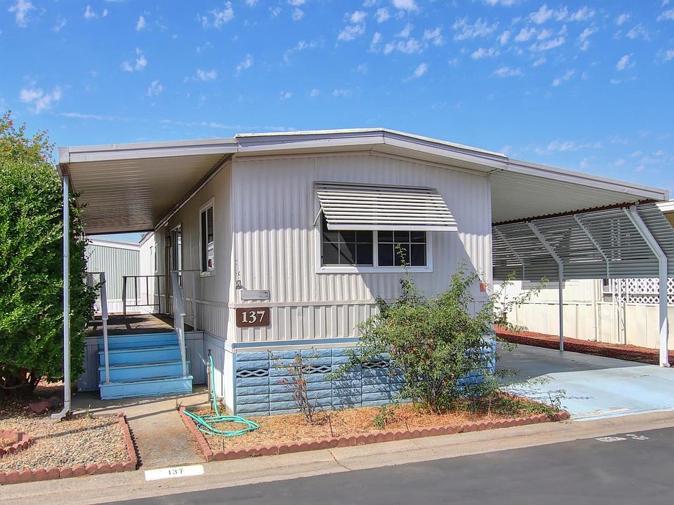 Carefree living in sought after Elk Grove community...The Oaks 55+. Tucked away single wide features 2 spacious bedrooms and an updated bath with jetted tub. Open great room concept. Modern kitchen, laminate floors, oak like cabinetry, newer appliances, double sinks & plenty of counter space. Pleasant bay window in nook area. Interior laundry area & ample closet space. Dual pane windows. Large outdoor porch area, covered awning parking & storage shed. Easy access to shopping & freeway.