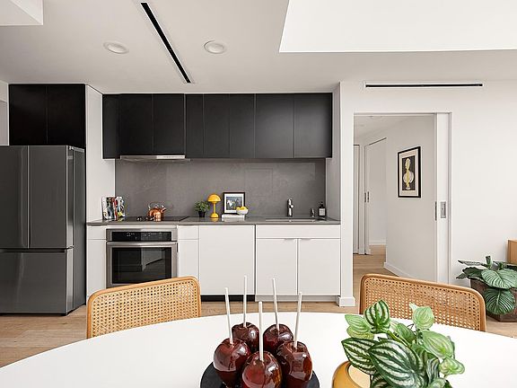 Enter into this special home through a vestibule off the elevator into a dramatic living space with skyline views in every direction and the perfect juxtaposition of warm wood finishes mixed with understated and elegant modern touches. Black and white flat-front modern cabinetry with finger pulls are perfectly meshed together with the addition of Gotham Gray honed Italian Quartz countertops and backsplash, as practical as it is beautiful. And an oversized pantry can easily accommodate all of your culinary tools and groceries should you decide to forsake the amazing restaurants right outside your door. Wide plank character-grade oak floors add a historical warmth to every room in the house. And don't miss the multi-zoned heating and cooling to keep you comfortable all year long. A suite of double-paned Shuko windows throughout the home offer vast expanses of glass for incredible airiness, while also ensuring peace and quiet from the sounds of the city. It's a masterful combination that ensures maximum light with unrivaled soundproofing.
