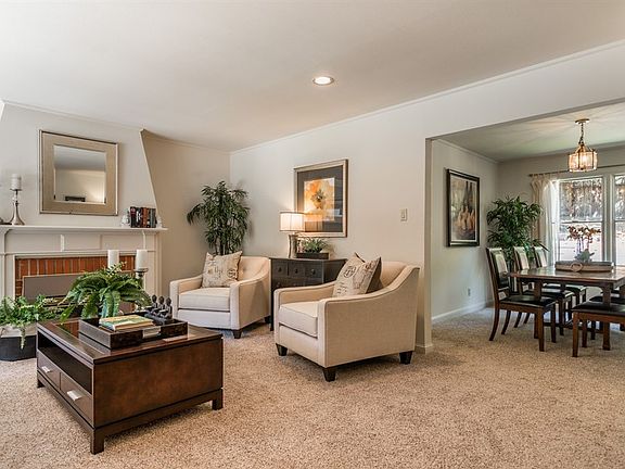 This inviting 2 Bedroom ,2 bath home features a freshly painted interior, wall to wall carpets, formal dining room which opens up to the spacious living room with fireplace. The large and bright eat in kitchen with plenty of cabinet space opens out to a sizable landscaped fenced back yard, perfect for indoor/outdoor entertaining and features a large covered patio, new lawn area, and mature trees. This move in condition home also includes a newer roof and garage door approximately one year old, and a 2 car garage with extra storage.Excellent Expansion Potential at an Excellent Price.