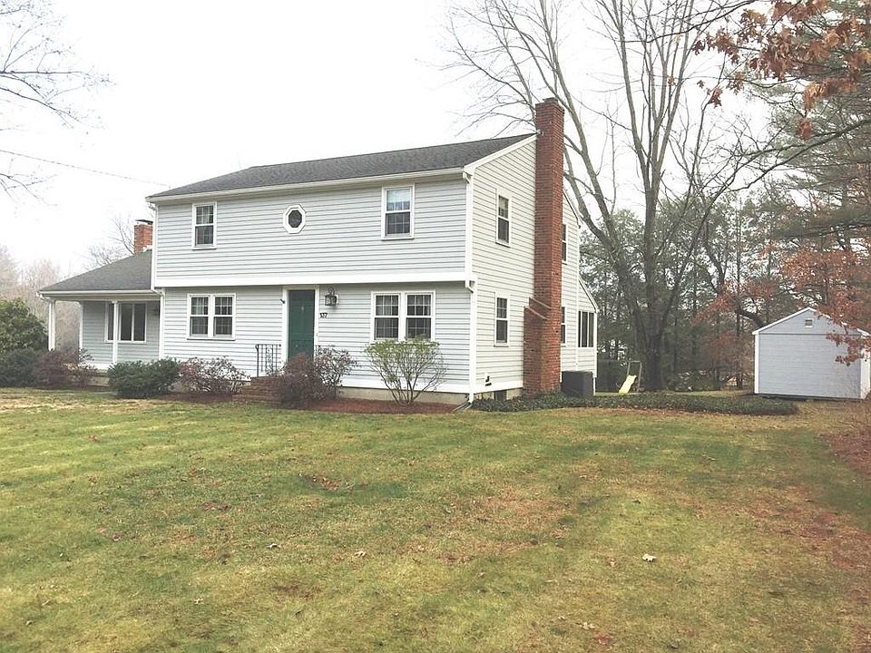 Spacious and gracious, well maintained home located in a wonderful neighborhood on a large and private lot close to primary school, playground, sports fields, wooded walking trails and shopping while only minutes to the highway for commuting convenience. From the farmer's porch, you enter a large, shiplapped cathedral ceiling family room with a fireplace/woodstove for cozy gatherings. The chef's kitchen features beautiful silestone countertops. The front-to-back living room with fireplace and the formal dining room offer gleaming hardwood floors and are perfect for entertaining. Four good-sized bedrooms also have hardwood floors and large closets,The screened porch overlooks a lovely brick patio ideal for summer cookouts. A large shed provides plenty of storage for your outdoor furniture and equipment. A partly finished lower level area with walkout would make a wonderful media or play room. Huge basement storage area. Great house! Great value!