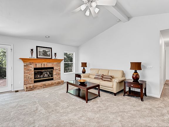 Welcome to this 3 bed, 2 bath open floorplan on a cul-de-sac located in sought-after Bear Creek Community! This amazing ranch home with a gorgeous view is on over a 1/2 acre lot! The backyard is full of lush trees for a private and intimate landscape. As you enter the home, notice the oversized great room, raised gas fireplace & vaulted ceilings. Light and bright kitchen offers an immense amount of cabinet space & includes a peninsula, gas range & pantry. Main floor laundry with cabinetry & storage closet is a plus and is right off kitchen! Additional features include: bay windows in master bath and breakfast room, oversized garage and driveway, NEW carpet, updated bathrooms with NEW flooring and painted vanities. Let's not forget about the NEW deck with aluminum railing and fenced-in yard, perfect for entertaining family and friends. Home has been freshly painted & is move in ready today! Minutes from shopping, dining, and award-winning schools in Wentzville! Don't miss out!
