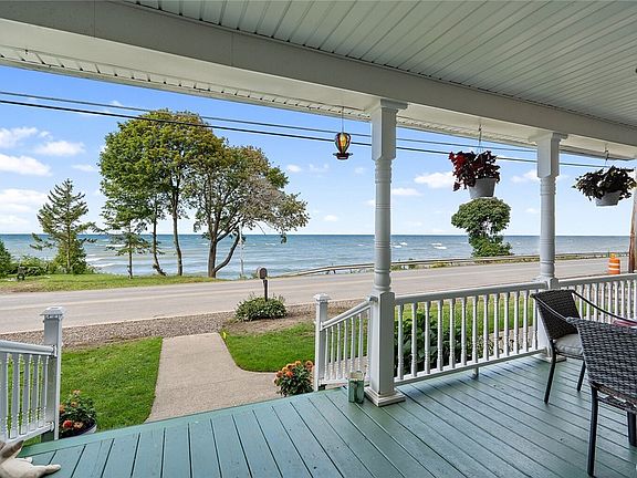Looking for that special home with panoramic views of Lake Ontario--look no further! Move-in ready and beautifully updated throughout; open concept first floor space, Lake views from nearly every room of the house! The chef will love the well planned, fully equipped Kitchen (includes all appliances), travertine flooring, butcher block prep area, Breakfast Bar, spacious Pantry, Island, Granite counters, and opens to large area for dining and entertaining, plus Custom Built-in Cabinetry, ideal for serving and storage. Family Room w/hardwood floors leads to grand size deck, 2-car+ garage w/workshop, sheds, fruit trees and private backyard. 2023 Renovations: Living Room with rich plank vinyl flooring, 3 Full Baths fully remodeled, freshly painted and carpeted stairway, hallway, primary Bedroom and Loft. GFA Furnace and Water Heater replaced 2023, all roofs redone between 2010-2021. Municipal Sewer installations are underway and will not be completed by closing. Wake up daily to the ever-changing colors of beautiful Lake Ontario and enjoy in the evening unobstructed views and sunsets from the expansive front porch!