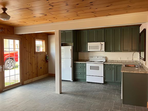 Two-story carriage house in Middlebury. Downstairs includes a large main room, dining room and kitchen, bathroom with shower, and three French doors. Upstairs includes one main bedroom, two smaller rooms that could be used as bedrooms, guest rooms, or home offices; bathroom with bathtub; washer and dryer. Propane heat downstairs and heat pump upstairs. Newly renovated. All new appliances including refrigerator, stove, microwave, and dishwasher. Walking distance to Rec Center, TAM, Hannaford. Small yard with apple trees. Pets ok. Landlord pays water, sewer, lawn care, snow plowing. Tenant pays for electricity, propane, trash removal, telephone, internet, cable.