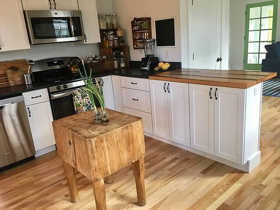 One bedroom downstairs and loft-style bedrooms upstairs. Big, open kitchen with gas range. Full bathroom with claw-footed tub and shower. Laundry in basement. House was constructed only two years ago. It stays cool and airy in the summer.