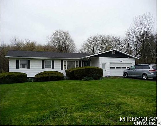 Spacious ranch has amazing Great room (33x15) with cathedral ceiling, gas fireplace, open to dining & kitchen & has 2 atrium doors that open to deck. Kitchen has wainscoting ceiling and skylight with numerous wooden cabinets. Skylight in dining area too! Hardwood floors in all bedrooms and hall. Wonderful garage space with a 2.5 car attached garage and a 2.5 car detached garage. Recent improvements include new eaves,roof & garage door on attached garage.