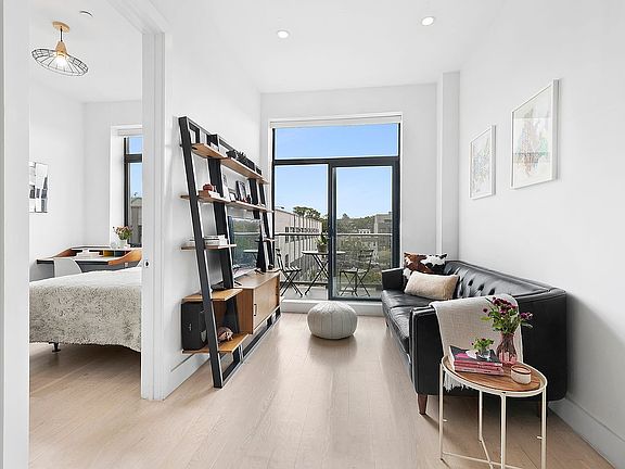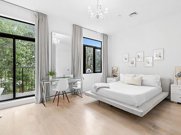 Welcome to this lovely, contemporary 2 bed/2 bath floor through condo in Bushwick, one of Brooklyn’s hippest neighborhoods. Upon entering the apartment, you are struck by the high ceilings close to 10 feet tall, the natural light and the wide-plank white oak floors. There are two private balconies on the north and south sides of the home, one off the living room and the other off the primary bedroom.