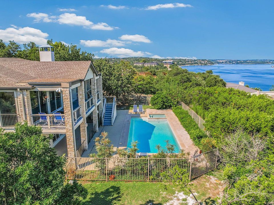 Tree-screened poolCharming lake houseSliding-glass doorsExceptional water viewsLarge kitchenBirds-eye-view of lake travisPrimary suite