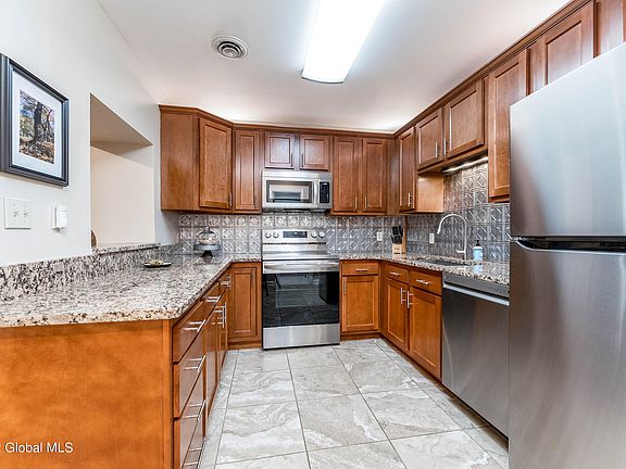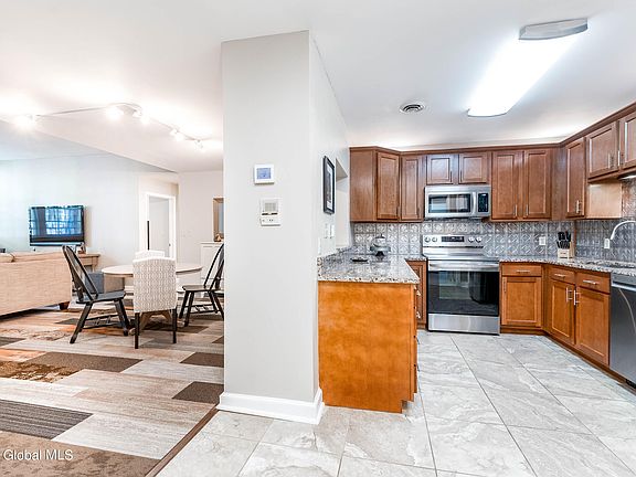 Welcome to Riverside, beautiful luxury condos in Schenectady's historic Stockade neighborhood. GORGEOUS + MODERN move in ready 1st flr 2 BR unit. UPDATED Kitchen w/ a breakfast bar, granite counters, stylish backsplash, BRAND NEW stainless appliances & LG ceramic tile flooring! New Carpeting, High END Wood Windows (Southern exposure!), 10 ft Ceilings, walk in tiled shower, updated powder rm w/ a NEW stackable washer/dryer. New heat pump for heat and AC. Enjoy the pool and patio in the summer, and leisurely walks through the historic neighborhood year round. Walking distance to shops, the casino, theaters, fine dining and so much more! Treat yourself to living in this lovely community! Ample parking for yourself and guests. By the river, but not in flood zone.