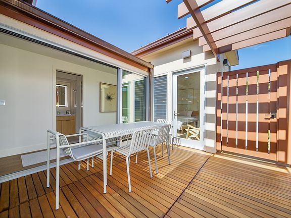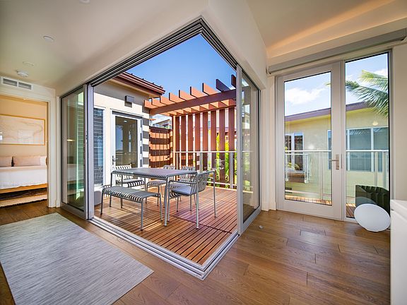Upon entering, you're greeted by a private entry courtyard, leading to the heart of the home. The kitchen features high-end finishes, including Caesarstone countertops, Walnut cabinets, and top-of-the-line appliances, such as a Sub-Zero fridge, Wolf gas range, and double drawer dishwasher. The unit is also equipped with modern amenities like central heating and air conditioning, plus a full-sized washer and dryer.