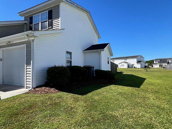 Won't last long at The Villas at Creeker Town...Affordable, well maintained 3 bedroom/2.5 bathroom townhouse with master bedroom with walk in closet and updated with master bathroom walk in shower on ground level. Laundry closet in half bathroom also conveniently located on ground level. Open living room with vaulted ceiling. Eat in kitchen with nice cabinet/countertop space and dining area overlooking the back patio and fenced back yard. You really must see! Let's go up the stairs to bedroom 2 and 3 which share a full bathroom. All bedrooms have a walk in closet too. Single car garage and a driveway parking space. Several overflow parking areas for guests too. Back yard has privacy fence and is nicely landscaped. Roof replaced 2021. Dishwasher and range (all appliances convey) replaced 2025. Master walk in shower and flooring 2025. Gated community with pool. Gate in process of being replaced Sept 2025. Convenient to Swansboro, Jacksonville, Camp Lejeune and more! Easy to show. Come take a look!