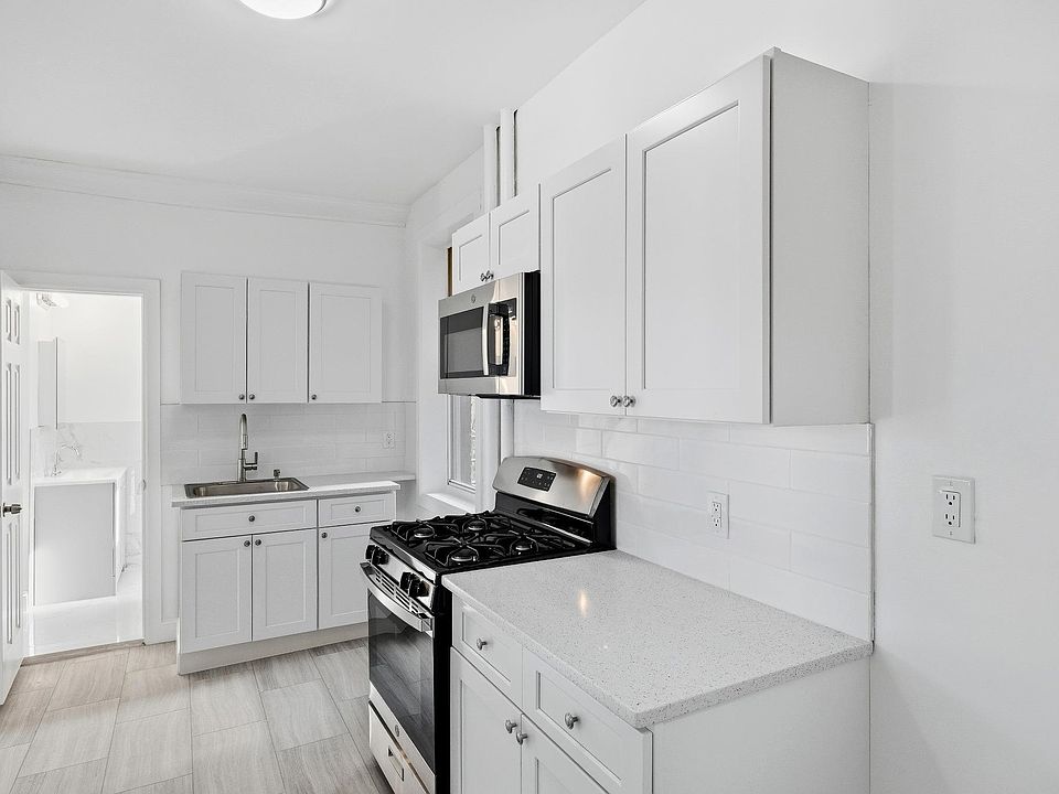 Be the first person to live in this renovated home! With massive windows throughout the living room, the place is constantly drenched with sunlight, accenting the gleaming hardwood floors throughout. The custom-built kitchen includes brand new Stainless Steele appliances (stove, microwave, and fridge) a smooth quartz countertop. The bathroom has also undergone a complete gut renovation, featuring brand new tiles. With quick access to bus stops and trains into NYC, this is a commuter's dream. Take the opportunity to call this place your home! Move-in ASAP