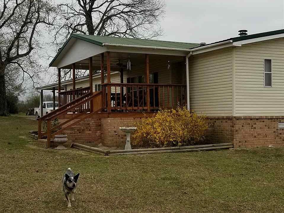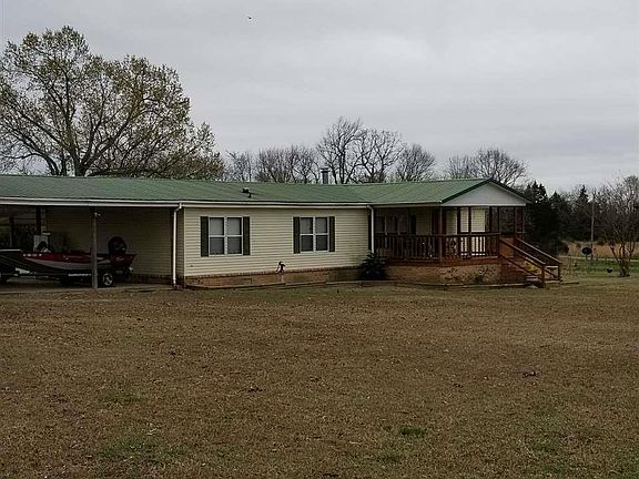 Super clean and move in ready! Nice doublewide on 7.5 acres features beautiful stone gas fireplace. Kitchen with center island and kitchenette. Master suite with garden tub. Split floor plan. 12X20 covered front deck, 17X35 covered back patio and 23X27 carport. 12X12 shop/storage with leanto. 38X48 metal barn for horses with chicken coop & bunny cages. City water, septic. Storm shelter. Permanent Foundation. Rural Development, VA, FHA! Show and sell!