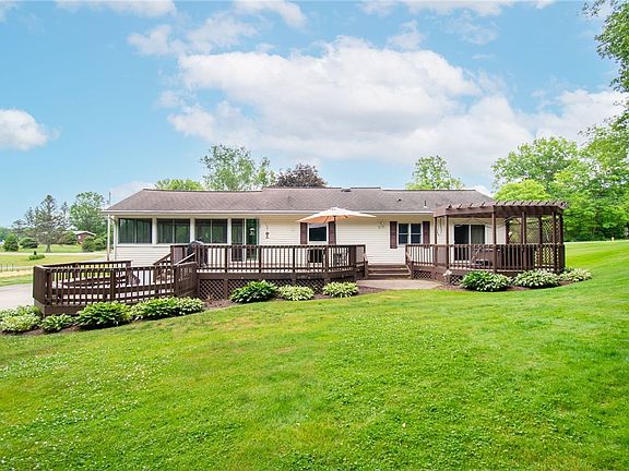 Situated on 1.47 acres bordering woods, this raised ranch style home offers plenty of room to roam indoors and out! Lots of sunlight from the large picture window in the living room follows you into the eat-in kitchen with lots of cabinetry, and out to the oversized 3 season room and expansive deck with hot tub. Finished lower level walks out to the 2 car integral garage. Additionally, there is a large 2 bay detached garage – think workshop or woodshop! The plant enthusiast will love the greenhouse!