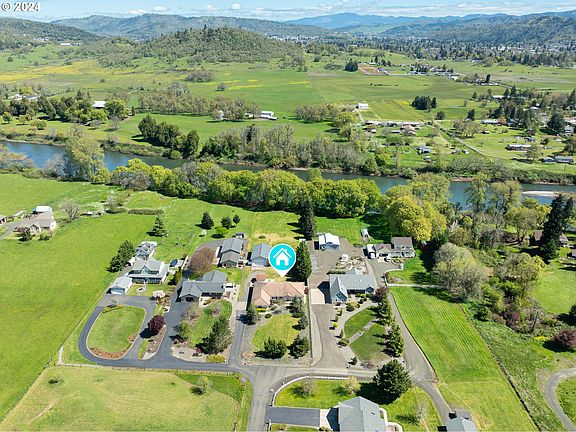 Beautiful custom, river-front luxury home in a highly sought after neighborhood. Tucked away in a private cul-de-sac, includes a large master with private bathroom and office. A spacious 2488sqft floor plan, with beautiful hardwood floors, on 2 flat acres leading to the Umpqua River, great for fishing or kayaking. Enjoy a cup of coffee and stunning sunrises from your back porch with views of the river and green mountains. Don't miss the 1500 SQFT insulated shop with ex50 amp, RV parking with plug & sewer dump. In addition to the oversized 2 car garage perfect for multiple vehicles and large shed perfect for ATV's, boats, and large toys! This gem features a tankless hot water heater, alarm and sprinkler system with water rights available.
