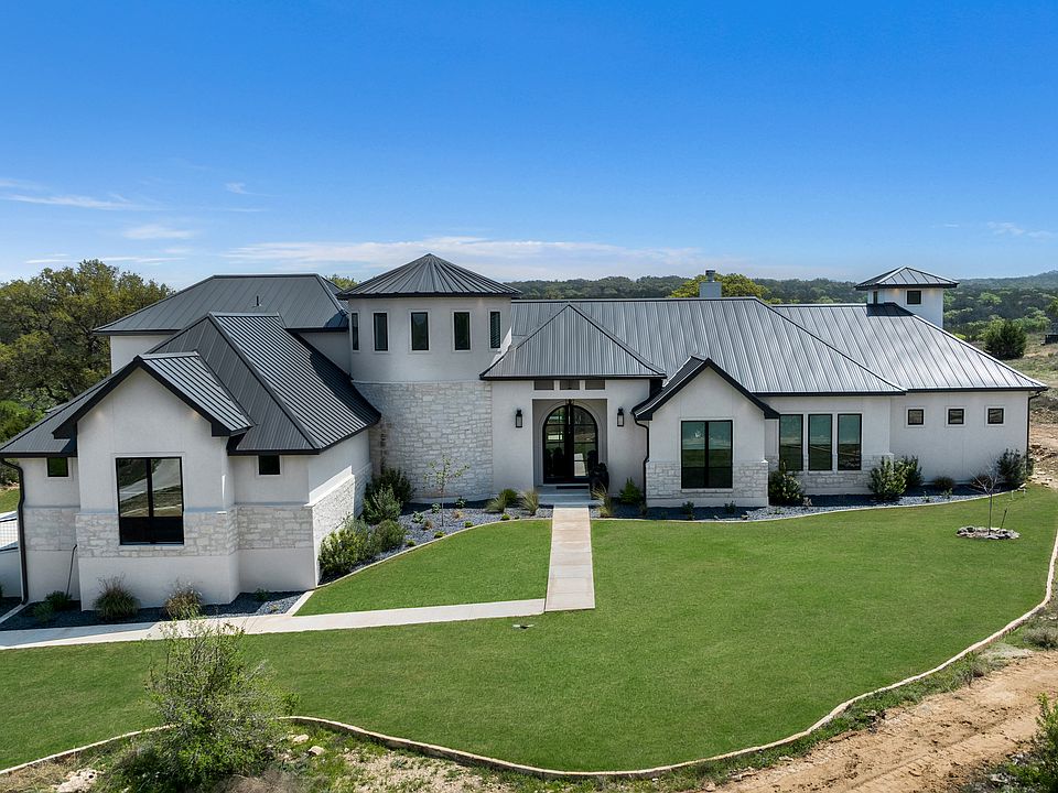 Perched on 15.32 acres in Sabinas Creek Ranch, this custom transitional estate offers a sophisticated take on Hill Country living, with unobstructed views and curated design at every turn. The interiors are defined by clean lines, natural light, and exceptional craftsmanship. White oak flooring runs throughout, complemented by smooth-finish walls, custom ceiling treatments, and designer lighting that adds warmth and depth. Expansive glass panels bring the outdoors in while maintaining a seamless connection between indoor living and the surrounding landscape. At the heart of the home, a professionally equipped kitchen features chef-grade appliances, custom cabinetry, and a large island, designed to anchor everyday living and effortless entertaining. The adjoining family room is striking in scale, with vaulted ceilings and exposed wood trusses. The master retreat is both spacious and serene, offering a spa-style bath and a custom walk-in closet. Three additional guest suites, including two on the main level, each feature private en-suite baths. The upstairs bedroom enjoys access to a large game room and a balcony overlooking the property. Additional spaces include a dedicated study and a flex room ideal for a gym. The home is hardwired for WiFi, ensuring reliable connectivity throughout. Outdoors, a screened-in covered patio with wood-paneled ceilings and a full outdoor kitchen opens to a resort-style pool and spa. This space was designed for year-round enjoyment and is positioned to take full advantage of the property's views and natural setting. An exceptional offering that blends refined architecture with the ease and beauty of Hill Country living.