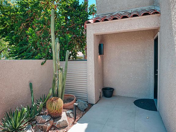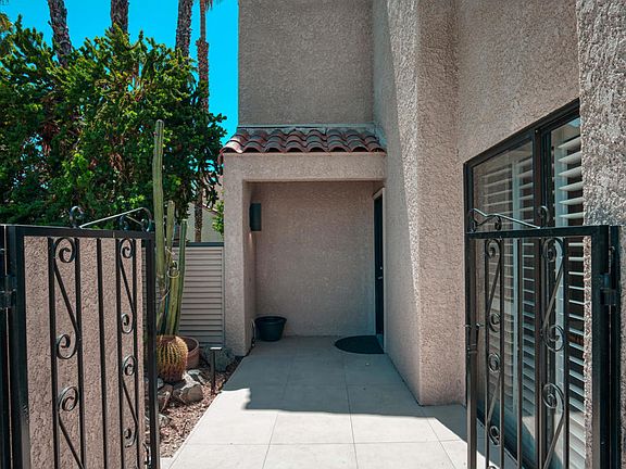 Recently renovated 2 bedroom 2 bathroom condo turnkey furnished. This home features 3 outdoor spaces with incredible views of the golf course (Hole 18), lake and mountains! Brand new porcelain tiles on the first floor. Enjoy retiled bathroom floors for a spa-like feel. Second floor glass landing recently installed to open the space. Upper deck overlooks the desert at night and has amazing views of the mountains and lake! The backyard patio is surrounded by beautiful greenbelts and flowers. There are several community pools and spas nearby, tennis courts, and other amenities. The kitchen has bar top seating, granite countertops and overlooks the living/dining nook making it an ideal spot for hosting get-togethers. Brand new washer and dryer recently installed. The vaulted ceilings and double sliding doors to an outdoor patio add an extra touch of luxury for indoor/outdoor living! The primary bedroom has an ensuite bathroom and is located on the upper floor with a view of the mountains! This home has a detached 2 car garage. Membership to Mission Hills Country Club is separate from condo monthly fees but HOA dues include community pools and spa, landscaping, cable, trash, exterior maintenance of roofs and painting and 24 hour guard gate. New paid 99 year lease. Easy to rent for long term stays. Welcome Home!