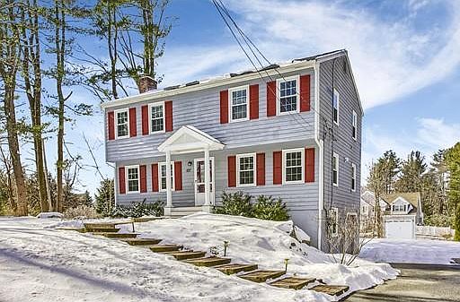 Pretty, landscaped setting for this updated 3 BR/1.5 bath Garrison colonial. The stylish portico adds curb appeal and flair to the entry area. Gleaming wood flooring thruout 1st floor including family room featuring wood burning fireplace and access to composite side deck. The bright, modern s/s and granite kitchen has an island, pantry and eat-in area that opens to the living room creating a flow perfect for entertaining and comfortable everyday living. All 3 bedrooms on the 2nd floor have newer carpeting including the front to back master with lots of windows and 2 closets including a walk-in closet. Both full bath and half bath/laundry have ceramic tile. The LL offers a playroom with daylight window, craft area, storage and 1 car garage. Energy conscious updates include vinyl Harvey windows (2012), 30 yr architectural roof (2009) and Vivant solar panels with transferable lease. Great location right next to Chelmsford Swim & Tennis club and rail trail. Close to shops and restaurants
