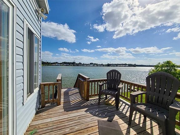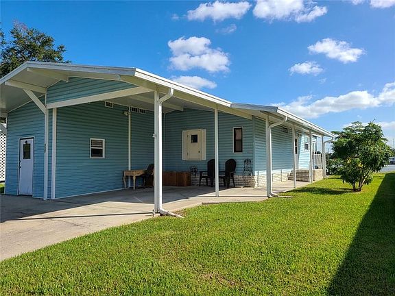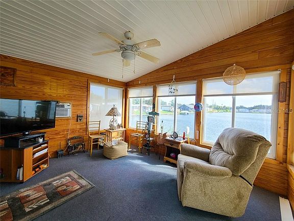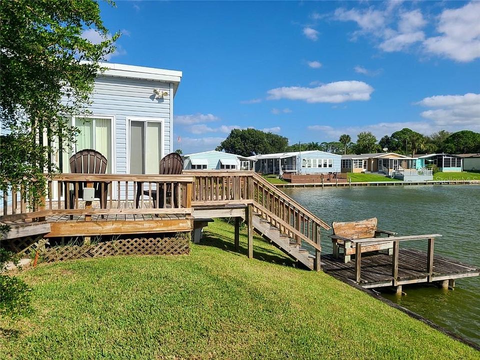 Waterfront Home in an active 55+ community! You can have it all with an updated home, on the water, with a dock and water views from most of the rooms in the home. This adorable 2-bedroom 2 bath home with high ceilings, open floor plan, larger master suite, updated tile shower and enclosed porch overlooking the water would make a perfect primary or secondary home. Centrally located to I-95, airport, medical and shopping. Nice sun deck and private dock is included with this upgraded home. You own the land, the home, the deck and the dock located in a community with amenities such as pool and clubhouse and a low monthly fee. With the newer flooring, windows and roof along with the interior laundry area, water views, shed w/workshop and irrigation system makes this a must-see home.