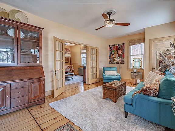 Currently configured as two distinct living spaces separated by elegant French doors, the layout also allows for a formal dining room if desired. The beautifully updated kitchen features a stainless steel gas stove, refrigerator, and dishwasher, along with a cozy breakfast nook and a convenient pantry. Just off the kitchen, you’ll find a powder room and a back staircase leading directly to the primary bedroom.
