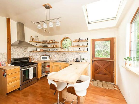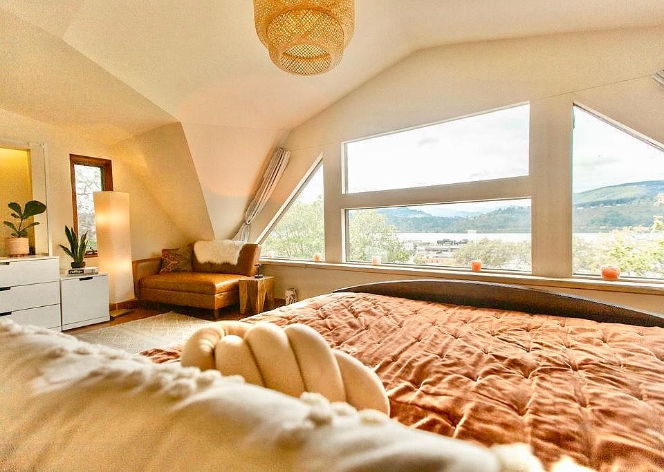 Hood River TREEFORT is tucked away overlooking & in walking distance to the Eventsite, and a flight of stairs up from downtown Hood River. Mindfully integrated with nature, each room contains a desk for working remote, queen memory foam mattress, outdoor lounging areas & 2 inflatable Stand Up Paddle boards are available. A perfect rustic value stay for a month + in the Gorge. Below the house parking is on street and free 24 hours a day. The space The home is set amongst trees and several tiers up from the road. A craftsman style home furnished with mid-century modern pieces deigned to bring the peace and elegance of nature in. The property has both upstairs and downstairs units, the ability to merge into one large home or into an a spacious loft with excellent views of the Columbia River, Eventsite and downtown. Below the house parking is on street and free 24 hours a day. Guest access Walking from Hood River TREEFORT to town or the waterfront is as easy as taking one flight down the Hood River Stairs. Several tiers of lawns are set up for comfortable outdoor lounging. The space can be split into one or two units. Below the house parking is on street and free 24 hours a day. Other things to note This is my first business venture, and I grew up in Hood River, as such I want your stay to be comfortable and joyous, don't hesitate to reach out if there is anything you need. A weekly gardener comes to tend to the indoor and outdoor plants. No smoking, abundant stairs to access property, free on street parking.