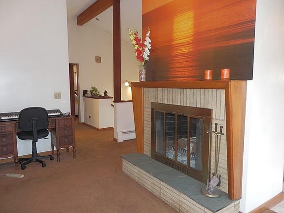 - Liv Dscrp: Flooring - Wall To Wall Carpet, Fireplace, Ceiling - Cathedral, Ceiling - Beamed
