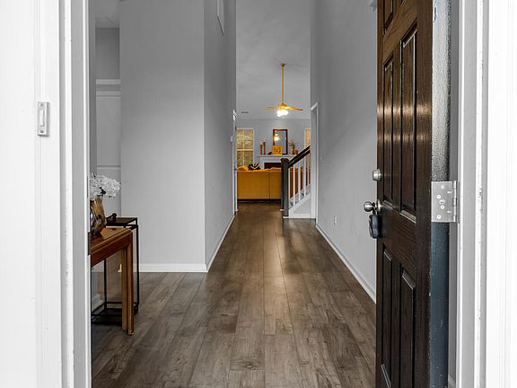 Welcome Home! Immaculate is an understatement. This beautiful 2-story home with the MASTER DOWNSTAIRS is nestled on a wooded lot with no neighbors behind the home. As you walk though the foyer you will be greeted by tall ceilings and gleaming laminate flooring. Walk a little further and you'll be greeted by a vast open connect with the kitchen and living room seamlessly connected with plenty of space for all the entertainment you want! The kitchen features granite countertops, stainless steel appliances, white cabinetry, and a large eat-in kitchen island! The screened in back porch is ready for your BBQ's with no neighbors behind you for that added level of privacy. All three bedroom are downstairs including the master suite with tile shower, and a full FROG upstairs for that added space!