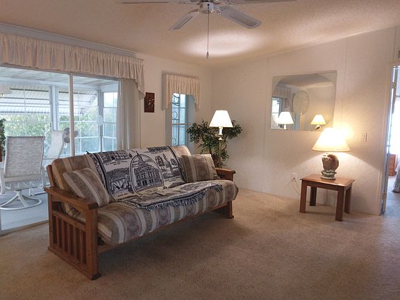Are you looking for a move-in ready home that's immediately available? Then you need to see this 2 bedroom, 2 bath home in a pet-friendly community. The home has laminate floors in the kitchen and dining room, and carpet in the living room. You'll find an ample amount of kitchen cabinets and counter space. The separate laundry room, with overhead cabinets, is next to the kitchen. You'll appreciate the split floor plan which provides separation for visiting guests, and each of the bedrooms, both of which are carpeted, have their own en-suite bathroom. The lanai, which is fully shaded by awnings, has direct access from the living room. There is a small patio just outside the lanai, and the perimeter lot provides an abundance of privacy for those who enjoy sitting in the sun or grilling outdoors. The double wide driveway can easily accommodate two vehicles side-by-side, and the front shed is conveniently located for removing or storing items. The air conditioner was replaced in 2018, the roof in 2010, and the tie downs in 2019. The stove was replaced in 2011, and the refrigerator in 2005. This 1997 Jacobsen home is being sold furnished/turnkey. The lot rent on this 1056 sq ft home is $841.68 plus a $57.70 pass-through tax, which includes mowing, trimming, extended cable TV with two HD cable boxes, and high speed internet service. This home is located in The Gardens, a premier 55+ community with a spacious resort-style clubhouse, Olympic-size heated swimming pool, hot tub, tennis and shuffleboard courts, monthly dances with live entertainment, and many other activities too numerous to mention. Call today to schedule an appointment if you would like to see this home. All listing information is deemed reliable but not guaranteed and should be independently verified through personal inspection by appropriate professionals. Integrity Mobile Home Sales cannot guarantee or warrant the accuracy of this information, measurements or condition of any property. Measurements are approximate. Lot rent is subject to change.
