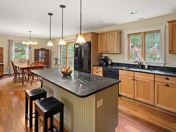 A magical find! Set on 77 acres with endless views, this beautiful home offers your own picturesque paradise, loaded with comfort. As you arrive, you'll be tempted to settle in on the 16' long covered porch to take it all in. Step inside to find gleaming cherry floors and an inviting floor plan. The open kitchen has a large center island, gorgeous soapstone countertops, and the ideal walk-in pantry around the corner. The bright dining room offers plenty of space for lovely gatherings, and opens to the back deck, blending the best of indoor-outdoor entertaining. Wander into the charming library, a very sweet spot for nestling in with a book and a cup of tea. The living room takes in the mountain views, with room for all to gather and enjoy the warmth of the nearby wood stove. And always sought after in Vermont - a terrific mudroom with large closets and built-ins. A first floor powder room and laundry complete the main level. The second floor includes a spacious primary suite plus 3 more bedrooms and an office, each with their own peaceful views. With even more space to use as you choose, the finished basement offers many possibilities to fit your own needs and includes a convenient 3/4 bath, as well as additional unfinished workshop/ storage space and access to the garage. The land outdoors includes perennials, fruit trees, sheds, and an abundance of space to garden, play, hike and snowshoe. Nearby Smugglers Notch and the Lamoille County Rail Trail - so much to enjoy!