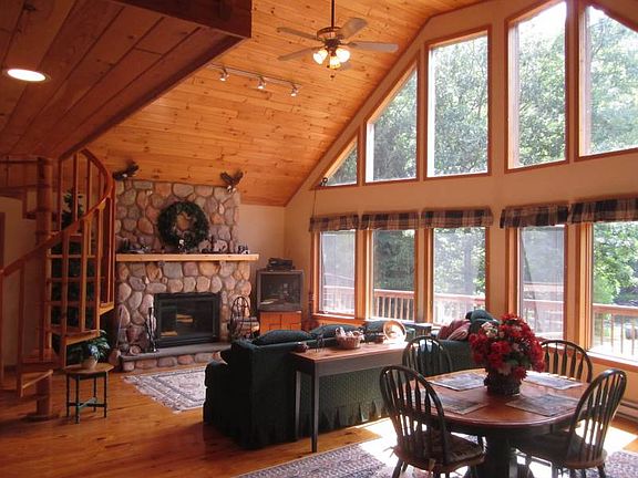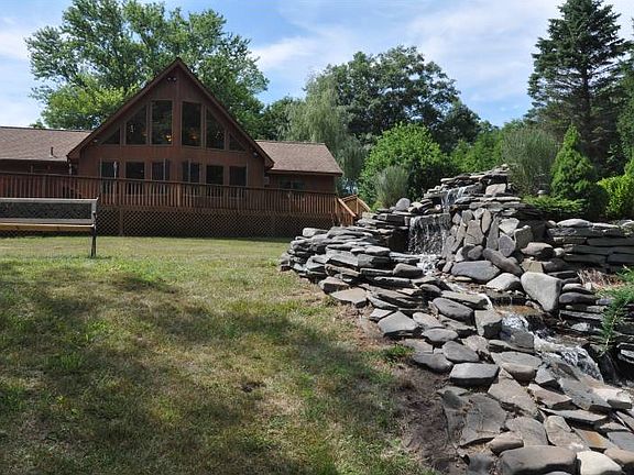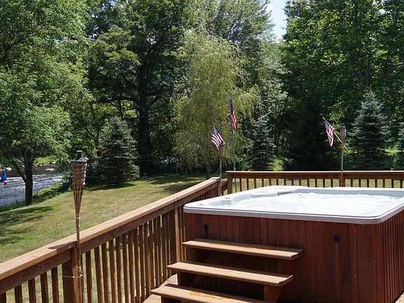 Custom 10 yr old Ranch/Chalet on a One Of A Kind Secluded RIVERFRONT (shy) 1 acre property.Totally private blue spruce treelined. Fish, raft wade or kayak in your own backyard OR just chill out listening to the peaceful flow of the stream and custom waterfall as you relax in your decks Hot Tub..Bald Eagles cruise by year round and often perch in backyard trees The home has vaulted pine planked ceilings and gleaming southern yellow pine plank flooring with matching southern yellow pine spiral staircase to loft. Hickory kitchen cabinets,River rock gas fireplace blows 40 K BTU heat. E glass Anderson Windows . R19 insulated walls R30 ceilings.Hard wired fire alarm and Security System. Custom Waterfall, delicious Artesian water well. This is truly a one of a kind beauty with fantastic mountain and stream vistas, an apple tree and pine trees everywhere. Ten minutes to ski slopes. Less than a mile from the New York State border . Less than 2hrs to NYC. There are NO association fees. Low taxes.