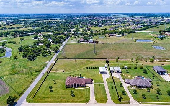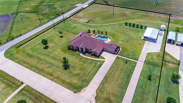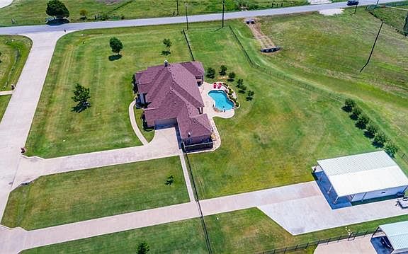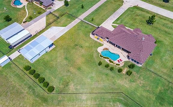 Welcome home to all you have searched for! Privacy and luxury abound with this beautiful custom home on almost 3 acres. Large windows with plantation shutters fill every room with light. Enjoy entertaining with large eat in kitchen with 42 inch cabinets and huge open living room. Master suite is huge! Relax in the pool after a long day and enjoy the wide open sky. The air conditioned shop with separate drive way and side RV parking pad is pristine with epoxy floor and separate office. Perfect for a work shop, party barn or home business. Four car garage is TEXAS sized and accommodates SUV's easily. Storage building conveys with property. Over 1000 feet of iron fencing is perfect for pets and kids to play.