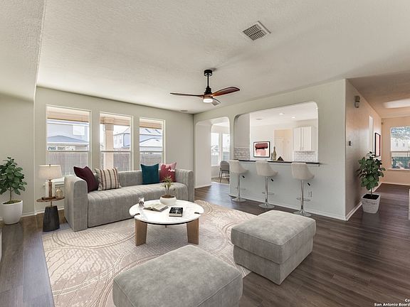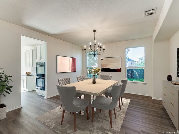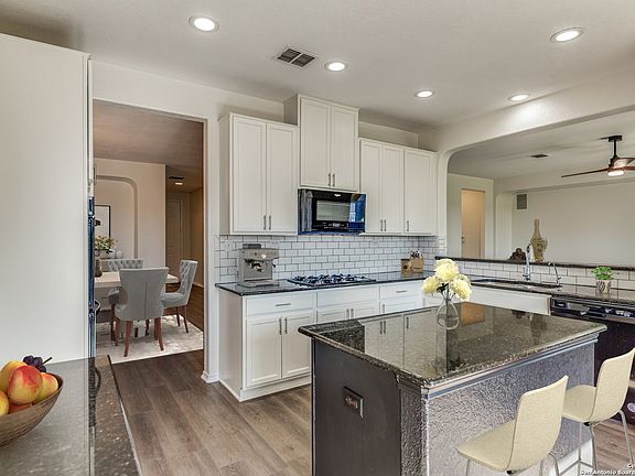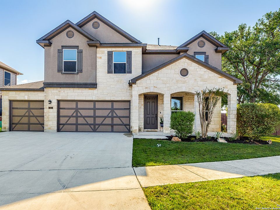 Absolutely stunning, updated 4 bedroom, 3 Car Garage, Herff Ranch home, 3191 Sq Ft, on very large .258 acre! Walking distance to Champion High School and Cibolo Creek Elementary with community pool, parks, so close to downtown Boerne. Award winning Boerne ISD Schools! Water Softener, Solar Panels, Double Oven, Spacious 3 Car Garage w keypad, Osmosis System, Brand New Luxury Vinyl throughout. Contemporary bathroom vanities with backlit LED touch mirrors and bluetooth, modern chandeliers, ceiling fans, and fixtures! Updates include fresh paint, all new easy care flooring(no carpet), master bath tile/shower seamless glass enclosure and updated kitchen tile, covered porch and back patio with swing, mature trees, privacy fenced completely re-stained, new fire pit, and groomed landscape. Bright and open master w large walk in closet, wired for security. Massive game room, lots of storage and closet space. Three secondary bedrooms, each with a brand new ceiling fan! Double oven, built-in microwave, gas stove, garage work space with new vanity/counter and working sink/faucet for shop, car cleaning and/or dog paw washing! extra clean refrigerator conveys, and even a doggie door already installed!
