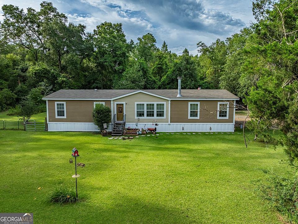 This well-kept four-bedroom, two-bath home sits on a beautiful 1-acre lot and offers generous space both inside and out. With approximately 2,400 square feet, the layout features a spacious split-bedroom design and an open-concept living area with seamless flooring, sheetrock walls, and a cozy fireplace. The kitchen is designed for functionality and style, showcasing custom cabinetry, a large island, walk-in pantry, and a dedicated prep area complete with a prep sink-perfect for everyday cooking or entertaining. Off the kitchen, you'll find a well-appointed laundry room with a sink and space for an additional freezer. The oversized master suite serves as a private retreat, complete with a spa-like bath featuring double vanities, a separate tub and shower, a makeup area, and a large walk-in closet. Additional highlights include a whole-house fan for improved energy efficiency, underground power lines for added curb appeal and reliability, neutral colors, and great natural light throughout the home. Outside, several exterior buildings and canopies convey with the property, offering added storage and flexibility for hobbies, tools, or recreational gear.