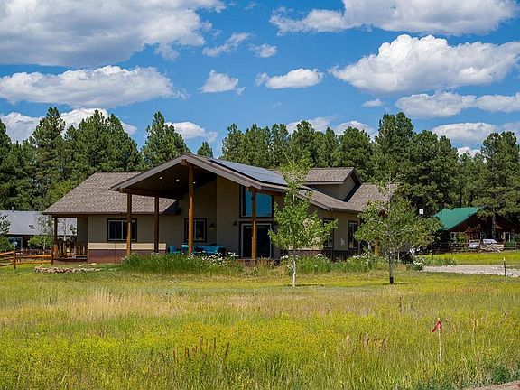 This beautiful, hardly-lived-in, partially furnished home is located in The Ranch Community, with large open spaces, mountain views, and only 5 minutes to the "core area" of town (grocery store, restaurants, etc). Open kitchen includes upscale finishes, under-cabinet lighting, large island, pot filler faucet over gas stove, walk-in pantry, and direct access to the covered deck for entertaining. Spacious master bedroom with private back patio. Master bath with double sinks, premium shower, and rare dual walk-in-closets. Guest bedrooms and shared bathroom can be screened from the living room by a beautiful, hand-crafted barn-style door offering excellent privacy for your guests. Fenced back yard is ready for your pets. Modern, energy efficient home with Solar PV system (owned not leased). Over the last 12 months solar has fully offset seller's electricity usage (part time occupancy). Exterior cameras, hard-wired security system, and Nest thermostat system with central A/C make this a great option for the owner who wants to control and monitor the home remotely. Circular driveway, separate parking area, and true three-car garage give you plenty of space for guests and toys. This home sits on 1.19 acres and borders 160+ acres of open space with over 2.25 miles of dedicated walking trails, all accessible right out your front door. As part of Pagosa Lakes, access the Rec Center, private fishing, clubhouse, and many additional miles of hard-surface walking trails and sidewalks. This home is 10 minutes to Pagosa Hot Springs, and 40 minutes drive to Wolf Creek Ski area, with "the most snow in Colorado". This home won't last long, so schedule your showing today.