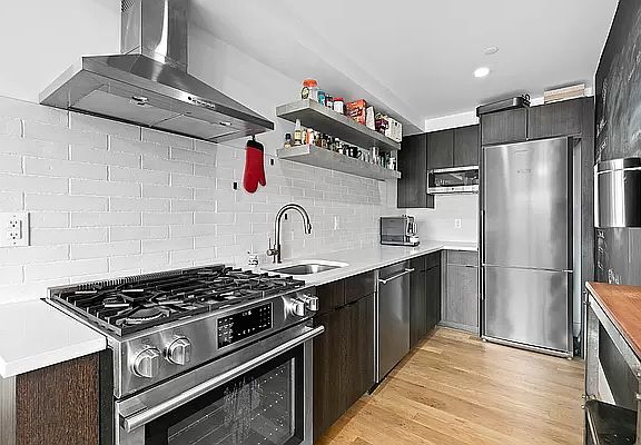 Be among the first to live in this well-thought-out two-bedroom, one-bathroom condo that's flooded with natural light and features two south-facing balconies. The spacious great room boasts beautiful hardwood floors - and is large enough to comfortably accommodate separate living and dining areas. The open kitchen is complete with sleek cabinetry, open shelving, a subway tile backsplash, and a full suite of brand-new stainless steel appliances - including a full-size dishwasher, built-in microwave, and a deluxe range with vented hood. Down the hall are both bedrooms with ample closet space in each - and the larger bedroom has a deep closet. The over-sized tiled bathroom has a modern and luxurious feel highlighted by the deep soaking tub and built-in glass shower panel. Residents will also enjoy the convenience of an in-unit washer and dryer. 1370 Bushwick is a newly constructed 10-unit boutique condo building with only two units per floor. Take advantage of the building's gym equipped with weights, cardio machines, and a Peloton bike. The furnished rooftop deck showcases picturesque views of the Manhattan skyline. Additional amenities include a video intercom, elevator, and bike room. With a convenient location near the J/Z/L/A/C trains - and around the corner from the Pioneer supermarket and trendy bars and restaurants - this home offers the very best that Brooklyn has to offer. The building is also a few blocks from "Achievement First Bushwick Charter School" which was just awarded the coveted "Blue Ribbon Shool" award.